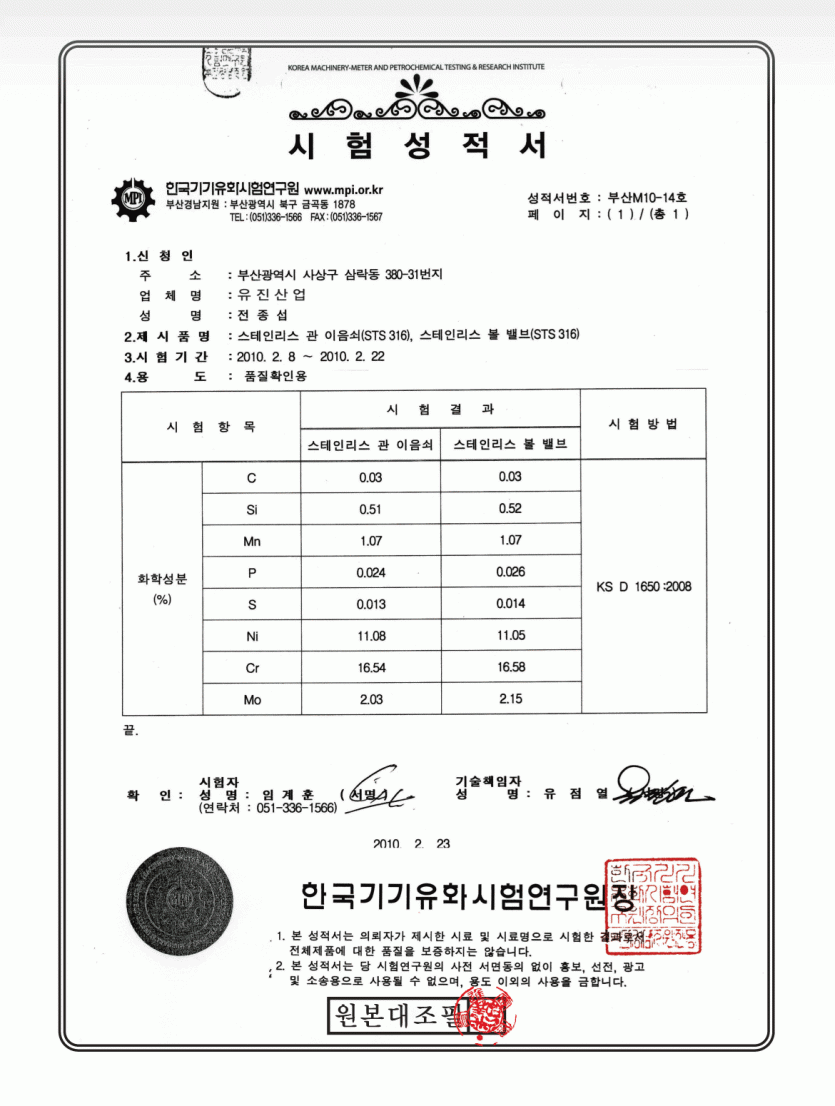 유진피팅 시험성적서