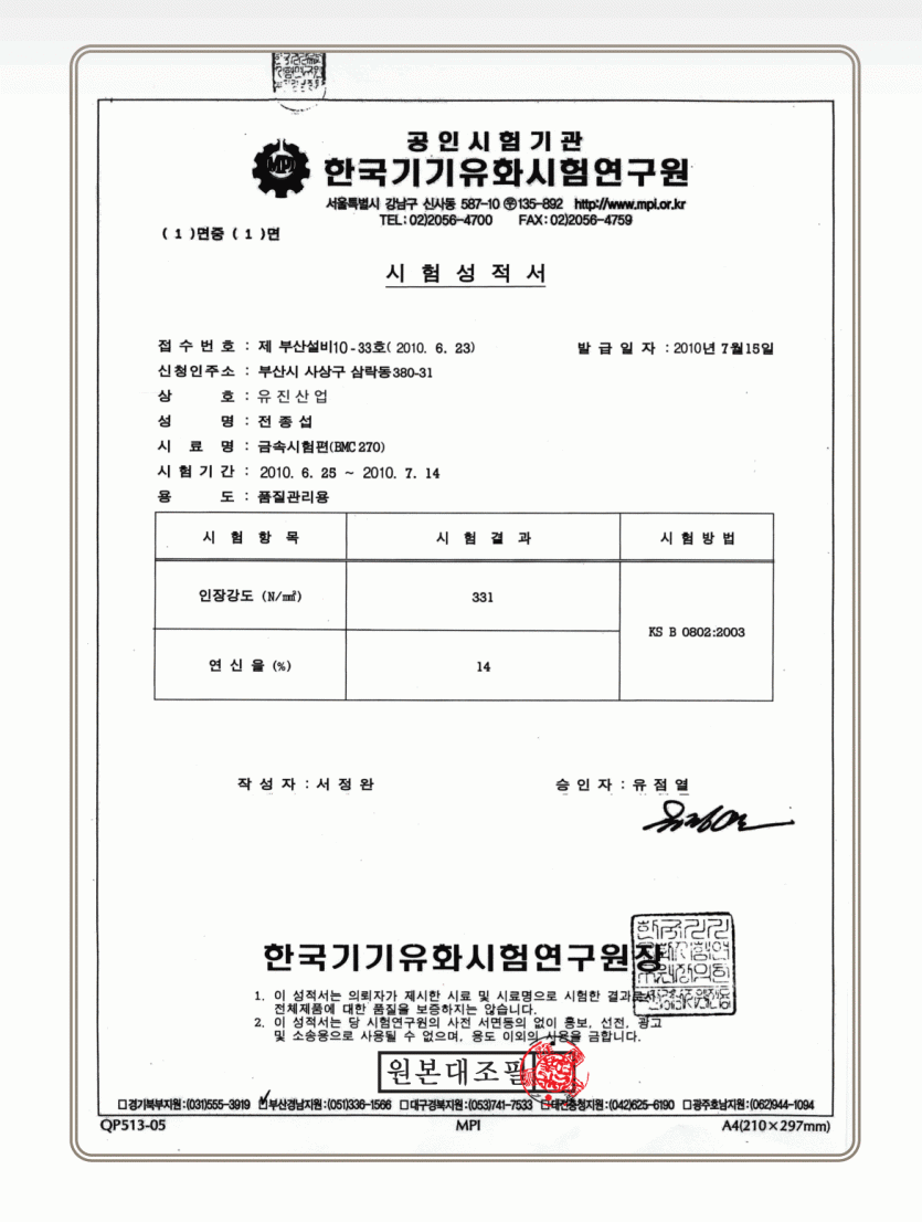 유진피팅 시험성적서