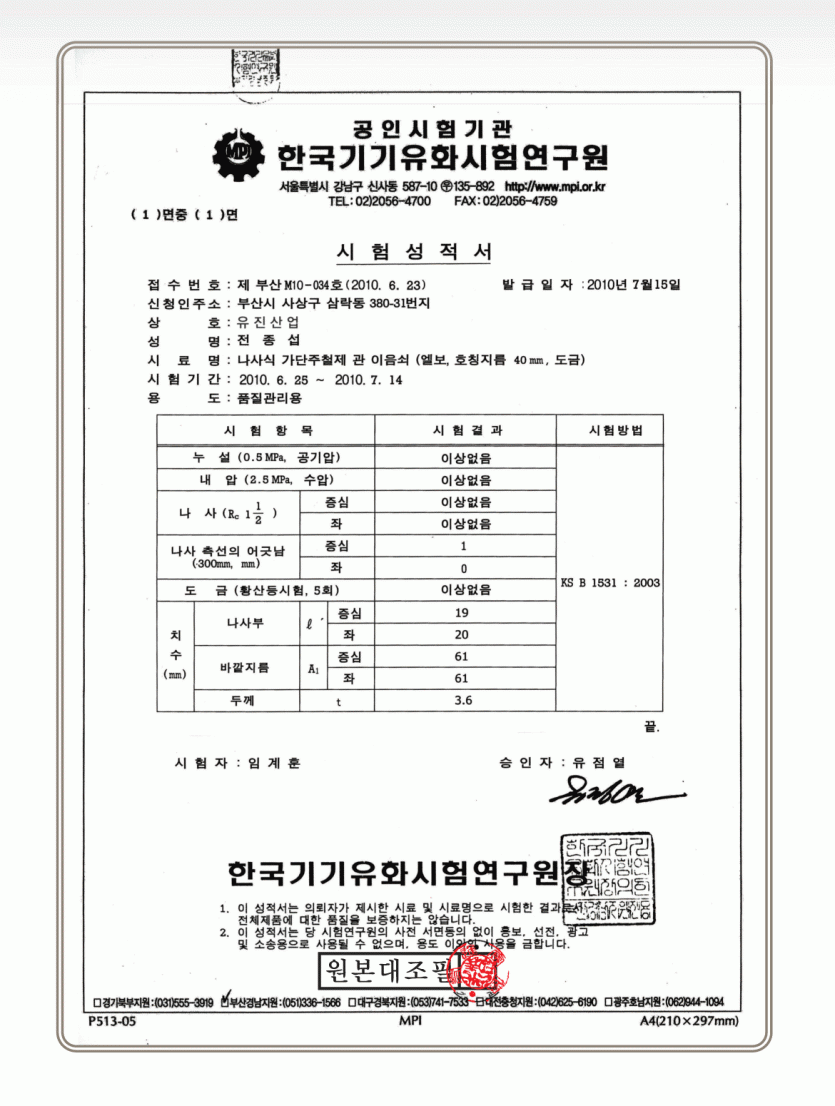 유진피팅 시험성적서