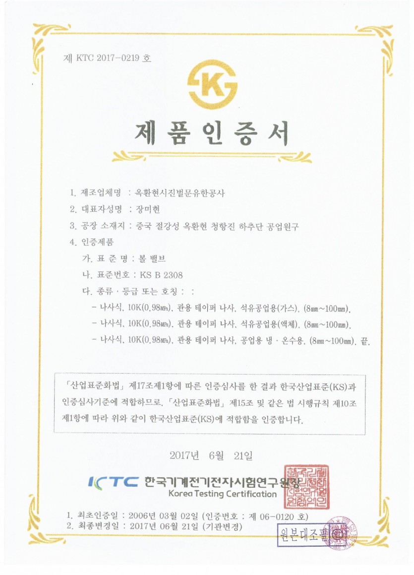(주)유진피팅 황동볼 KS 인증서