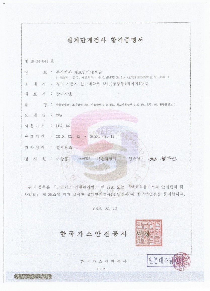 황동가스볼밸브 20A 합격증명서